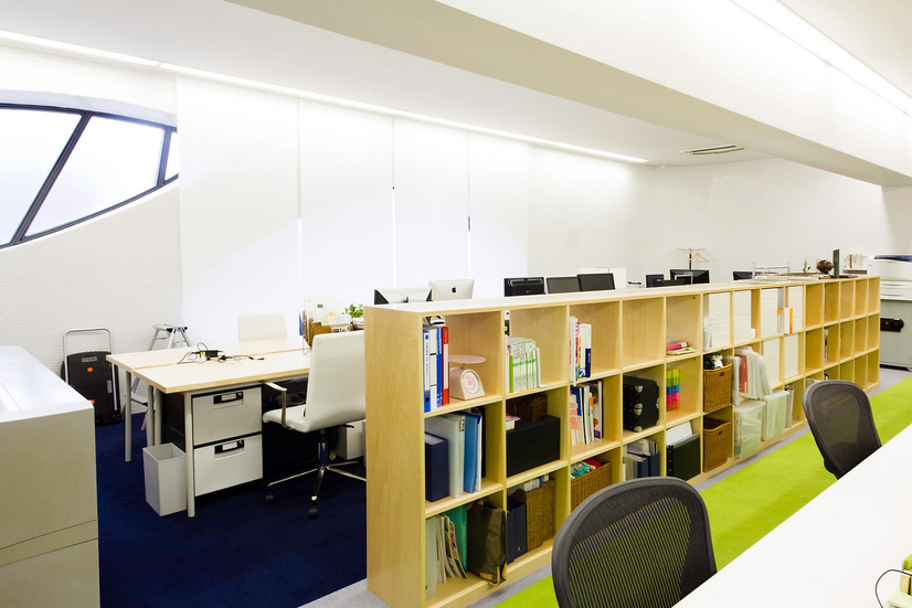 壁柱が特徴的な大きなワンルーム空間を、長い本棚によって短冊状に間仕切り、様々な会社が集まる「ホールディングス」ならではの設計としました。ワンルームに並列された本棚は、座位では目隠し、立位では全体を見渡せる高さに設定し、室内の拡がりを感じられるオフィスになっています。状況に応じ様々な体色に変化するカメレオンのように、各本棚ごとに異なる色彩を設け、みんなが共通で利用するミーティングスペースだけは、全ての混色である黒色を用いました。